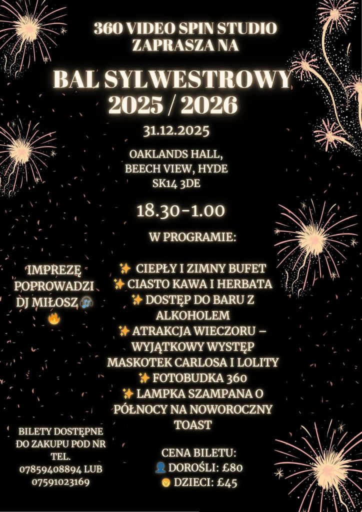 360 VIDEO SPIN STUDIO zaprasza na niezapomniany Bal Sylwestrowy 2025/2026, który odbędzie się 31 grudnia 2025 roku w Hyde, w dogodnej lokalizacji w Greater Manchester, bardzo blisko Ashton-under-Lyne. To idealna propozycja dla wszystkich, którzy chcą powitać Nowy Rok w świetnej atmosferze, przy doskonałej muzyce i z atrakcjami dla dorosłych oraz dzieci.